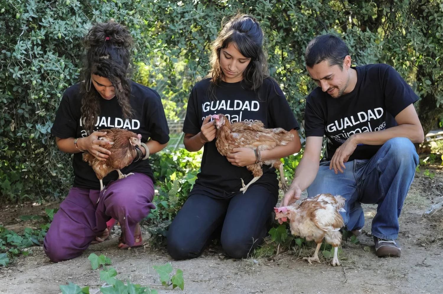 Three activists with hens freshly rescued from an egg industry in Spain. (We Animals Media)