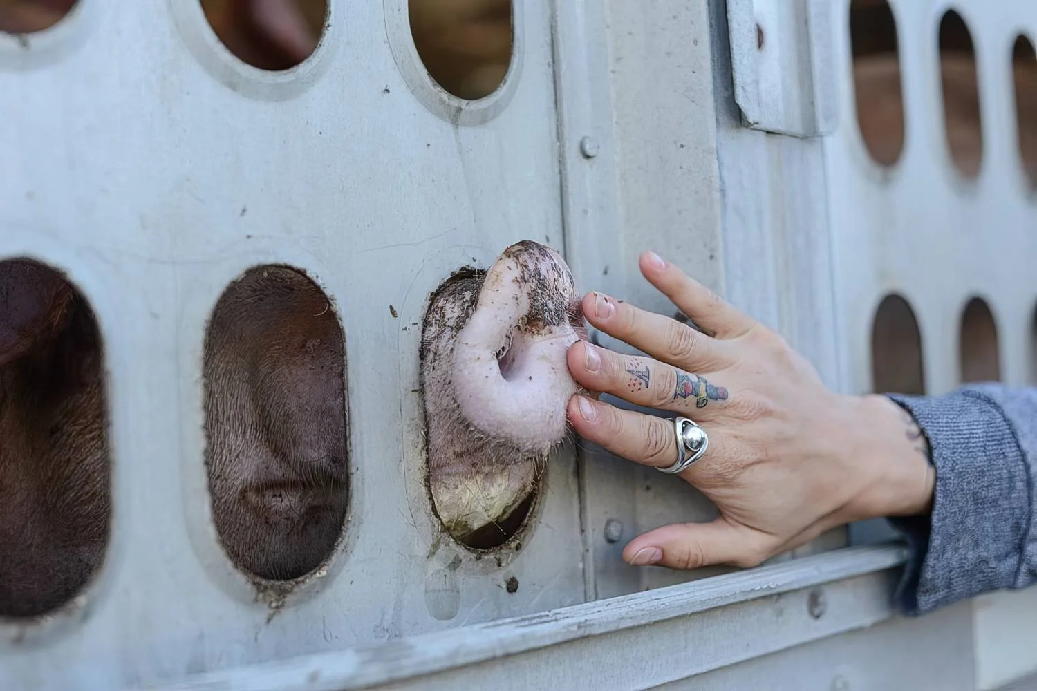 A human hand touches the nose of a pig in a truck bound for slaughter. (We Animals Media)