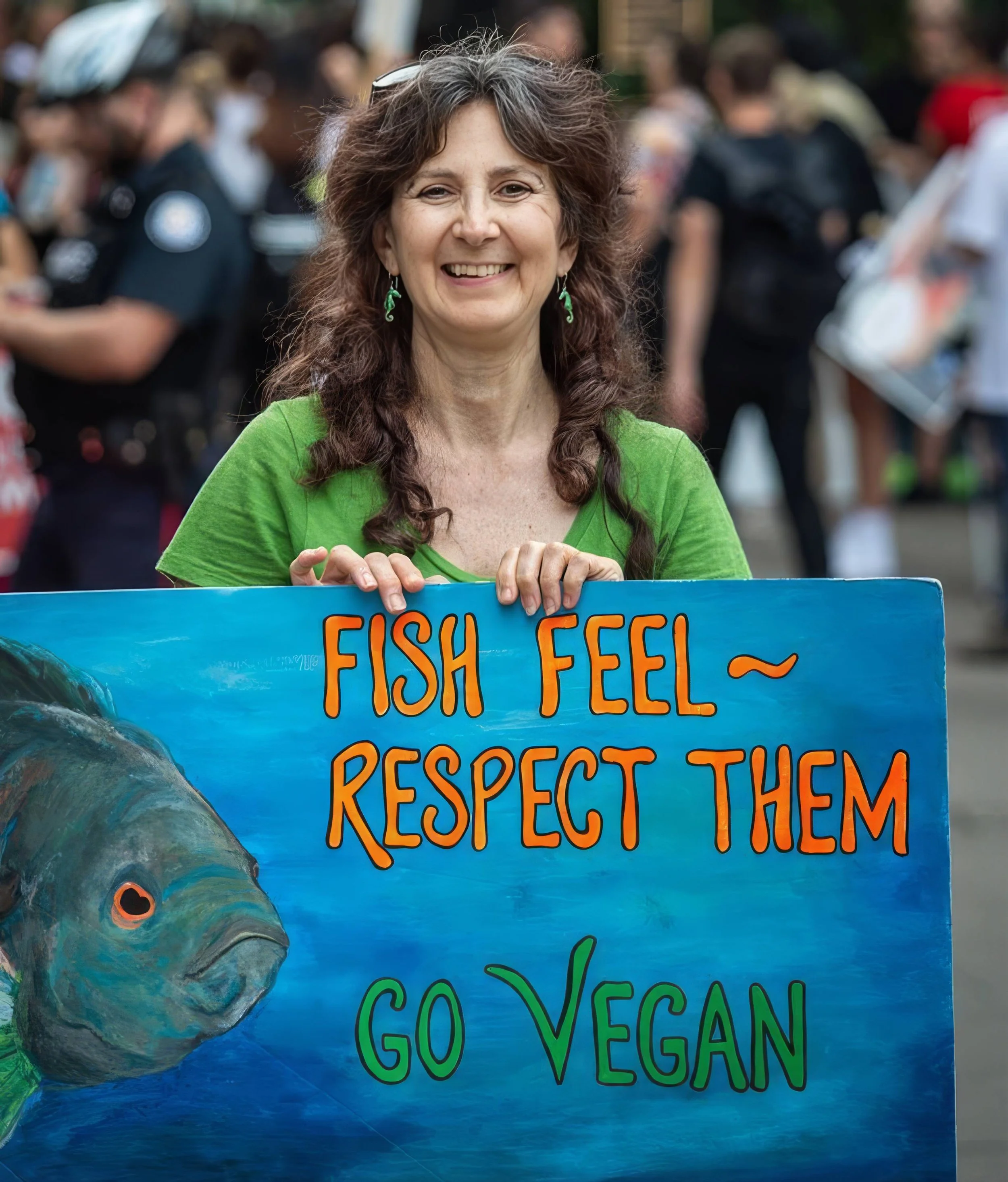 An activist takes a stand for fishes. (We Animals Media)