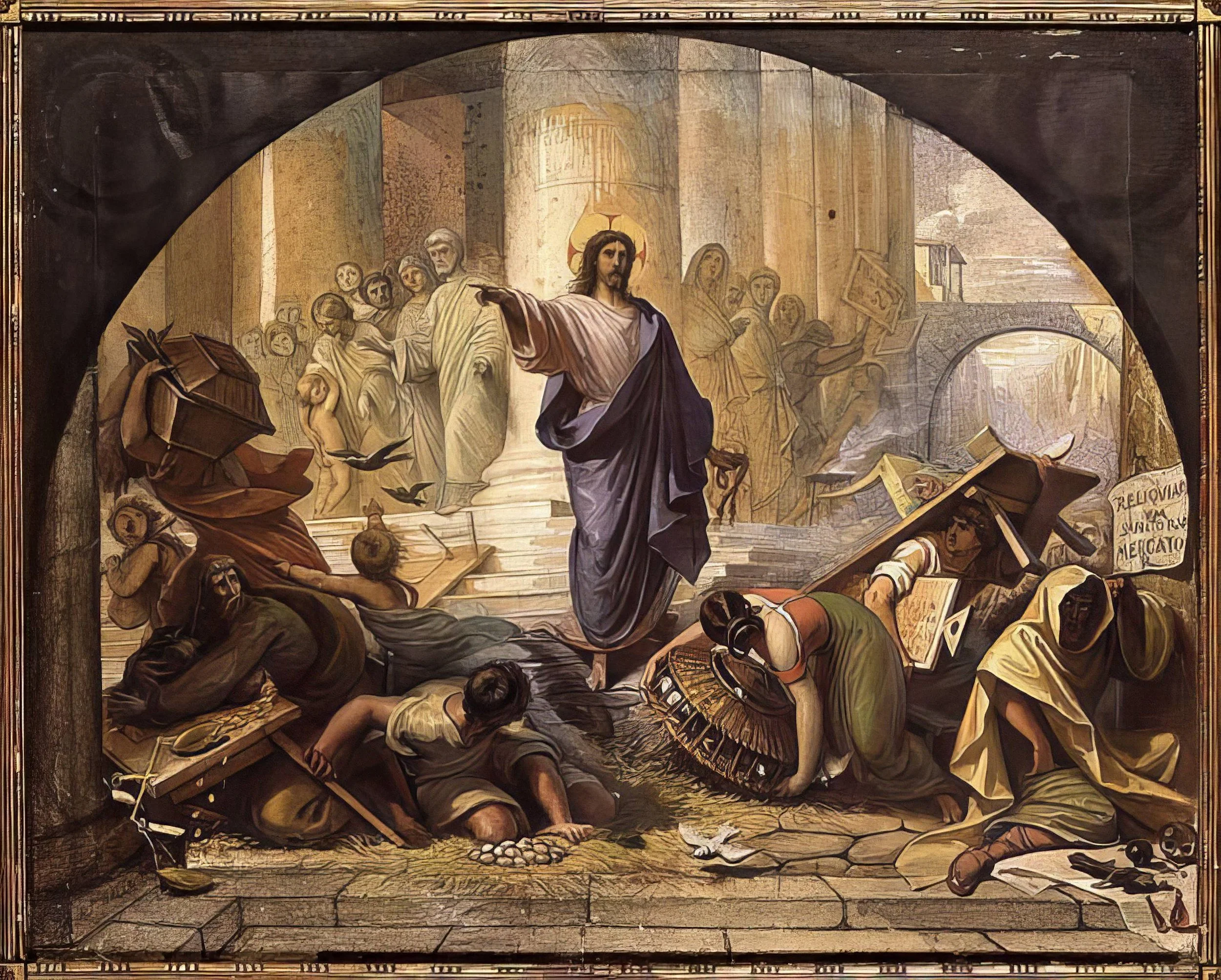 In the temple he found people selling cattle, sheep, and doves and the money changers seated at their tables. Making a whip of cords, he drove all of them out of the temple, with the sheep and the cattle. He also poured out the coins of money changers and overturned their tables.